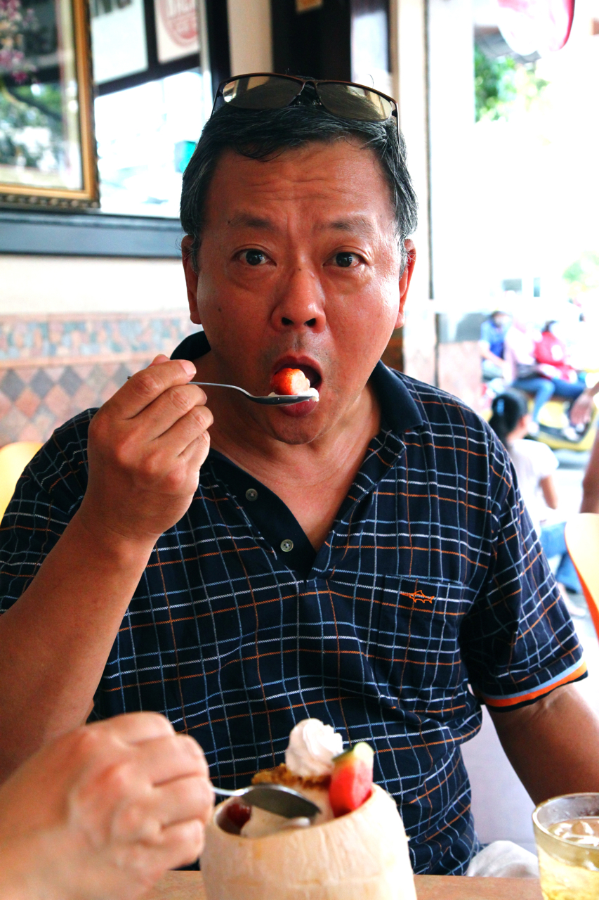 Ic-cream made with coconut milk, scooped into a coconut, topped with fresh watermelon, strawberry, dragon fruit and candied pineapple. I thought the ice-cream was just plain vanilla, and didn't find it all that special 'til the lady saw my puzzled face and taught me to scrape off the meat on the inside of the coconut and eat it together with the ice cream. Ahhhhh, much better it was. Gonna tell them to hold the chocolate sauce next time. Too sweet for me.